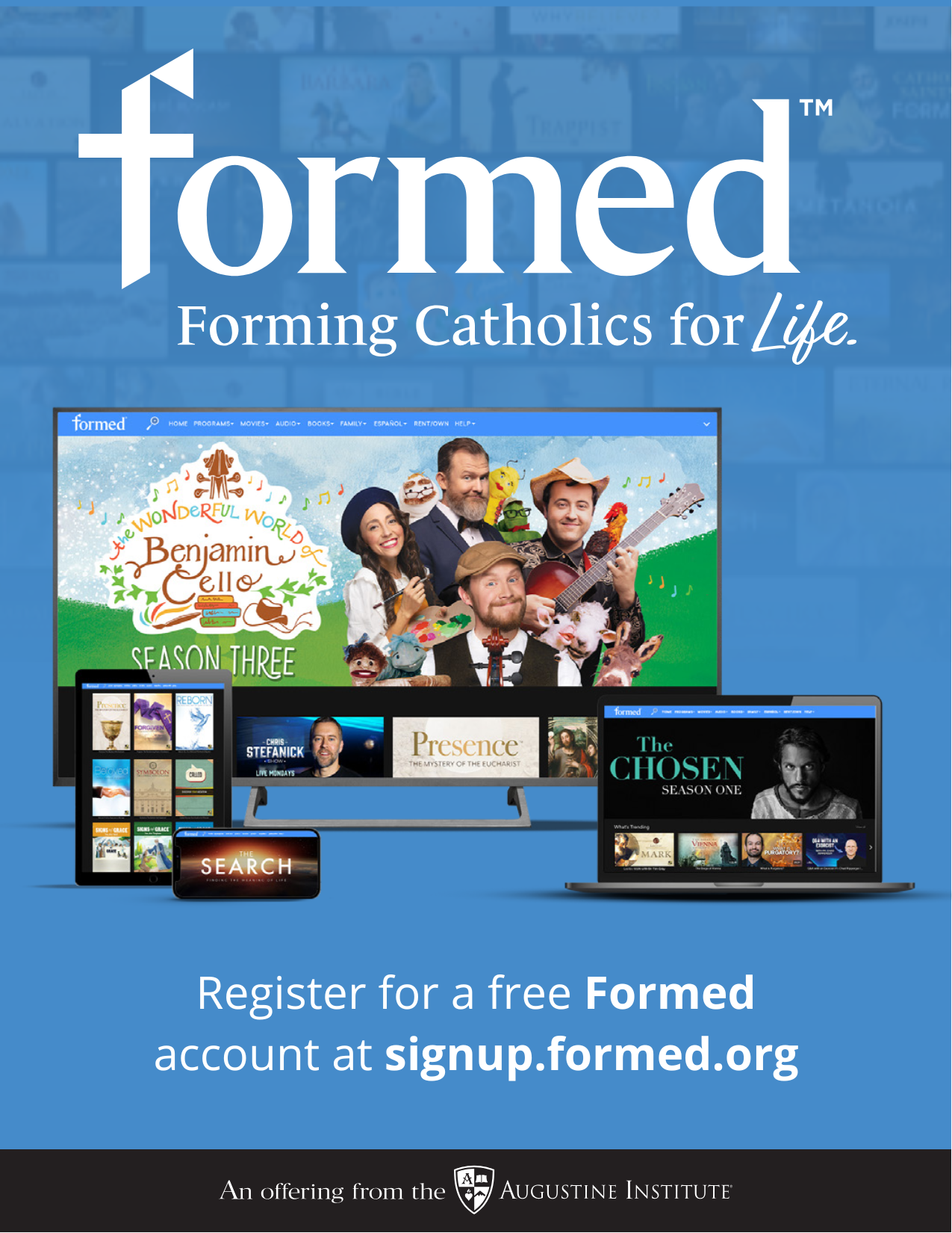 Diving into the beauty of the Faith has never been easier: at home, on the go, or from any internet-connected device. Discover small group Bible studies, inspiring children’s shows, sacramental preparation resources, family-friendly movies, and more! There is something for every member of the family and our Catholic community to help you grow closer to Jesus Christ and His Church. Led by the Augustine Institute and Ignatius Press, and in collaboration with over 100 content providers, this site reaches more than one million subscribers worldwide.